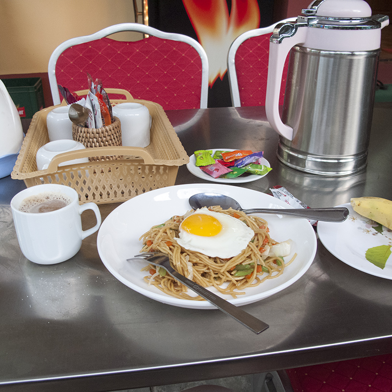 Frühstück inbegriffen. Was Wollen Sie? Toast wie gestern! Haben wir heute nicht. Also irgend etwas! Später weiss ich: a) Toast&Banane b) Nudels&Banane c) Reis&Banane a-b-c zyklisch vertauscht. Neskaffee ist gratis.
