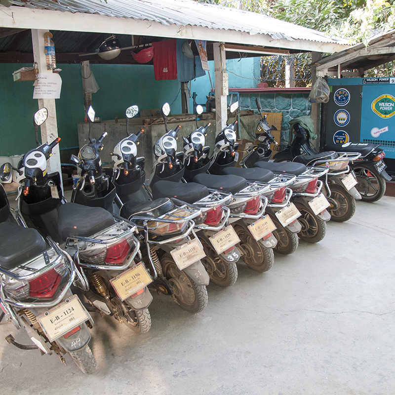 Jeden Morgen neben dem Notstromgenerator schön aufgereiht die E-Bikes, augeladen, fahrbereit. Der Tag kostet 10 Dollars. Sie garantieren Unabhängigkeit im Umkreis von etwa 50Km. Die Hupe funktioniert einwandfrei. Kofferraum abschliessbar unter dem Sitz. Mit den E-Bikes darf man überall fahren, auf den Feldwegen, bis hart an die Barfusszone der Pagoden.